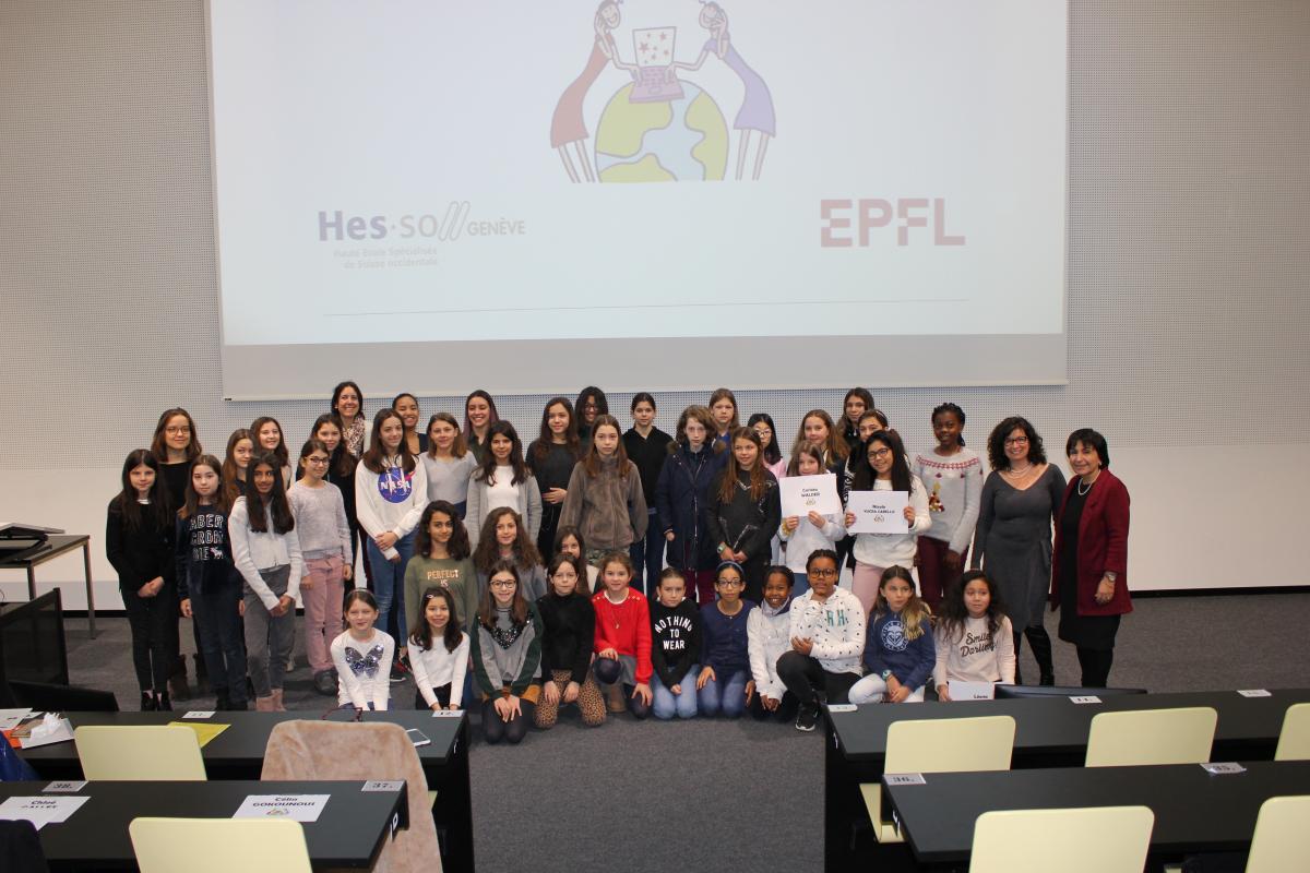 50 jeunes filles de 9 à 12 ans ont reçu leur attestation de cours devant leurs parents et en présence de Luciana Vaccaro, rectrice de la HES-SO, François Abbé-Decarroux, directeur général de la HES-SO Genève, et de Farnaz Moser, directrice du service de promotion des sciences de l’EPFL.