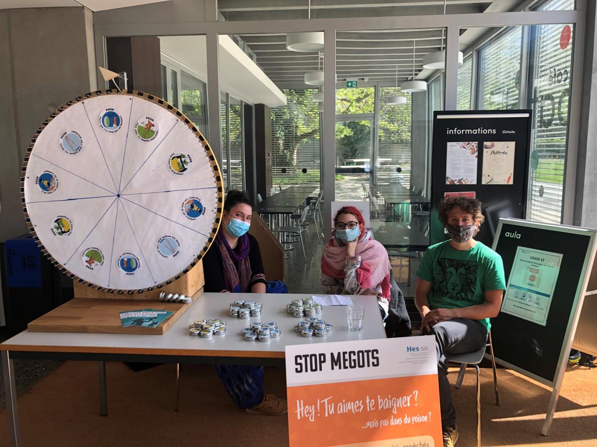 Mardi 18 mai (matin) sur l’esplanade du campus Battelle, Coralie Constantin, Arena Spillmann et Vincent Zeder de la HETS ont tenu le stand de cendriers portatifs dans le cadre d'un projet qui a pour but d’encourager l’utilisation des cendriers - pour en finir avec les mégots !