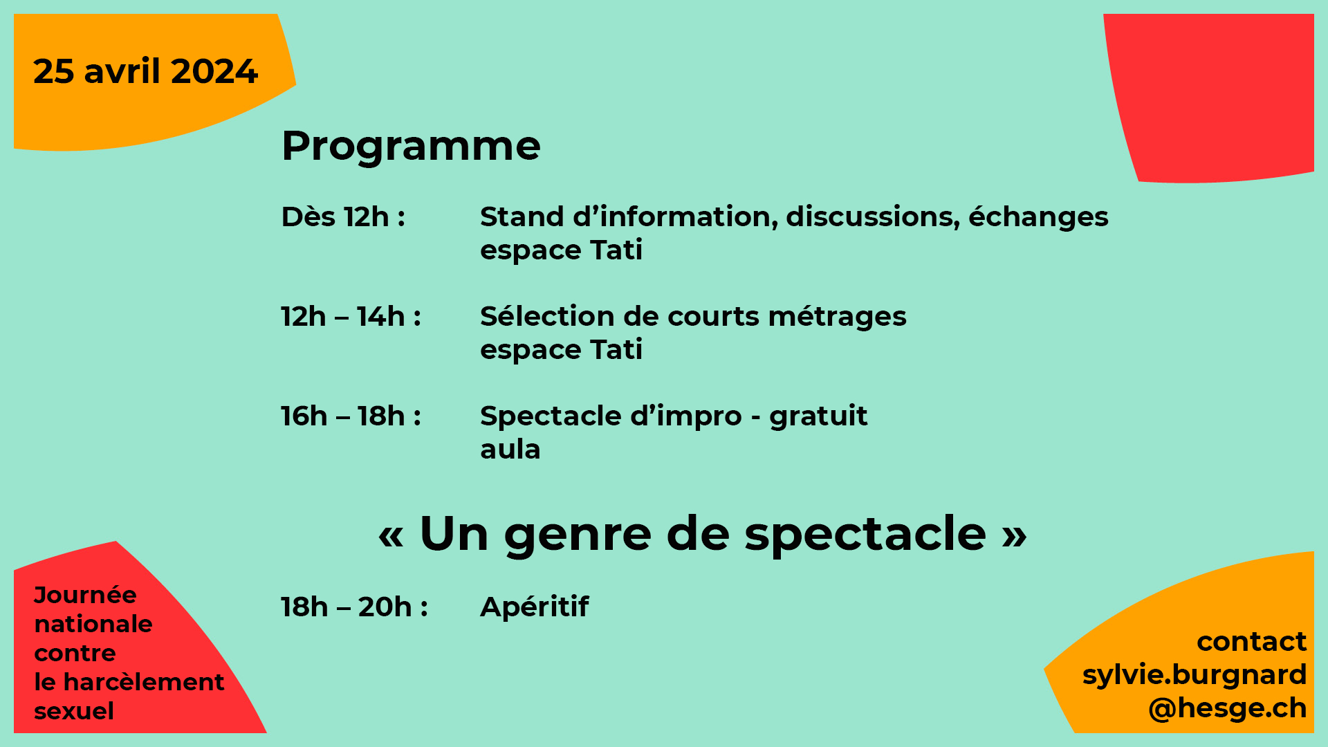 Durant la Journée nationale contre le harcèlement sexuel (Sexual Harassment Awareness Day), la HEG se mobilise et propose des activités inédites : spectacle d'improvisation, projections de films, stand d'infos en présence de notre répondante égalité.