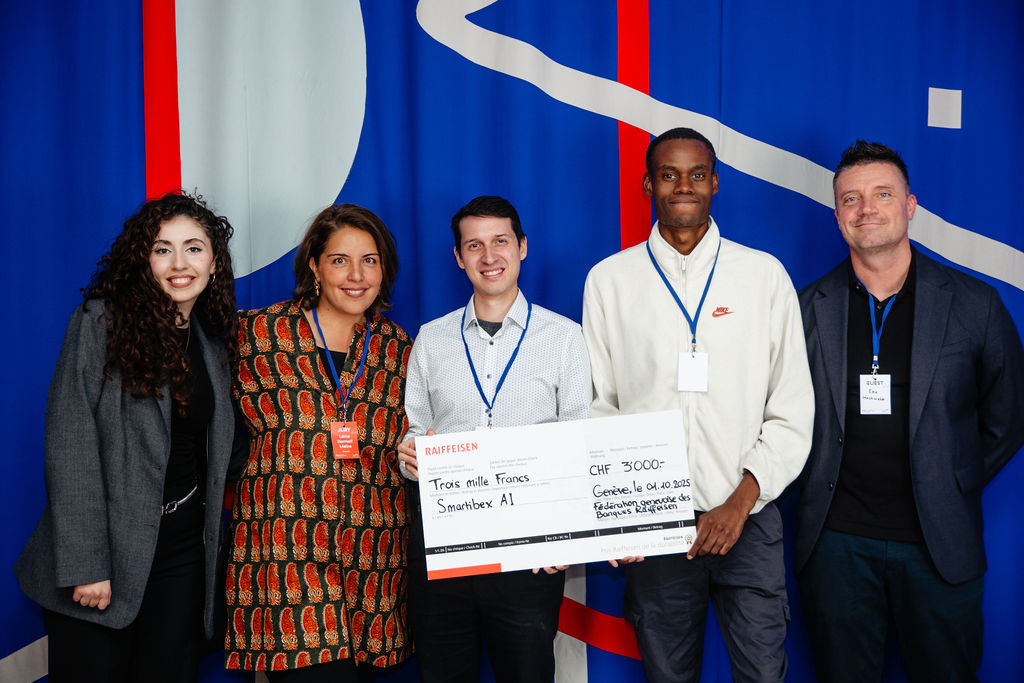 - Prix Raiffeisen de la durabilité - Smartibex AI - de g. à dr. : Karine Martirosyan (Raiffeisen), Laima Etermadi Matine (Raiffeisen), Richard Sierra & Kevin Bonga (Smartibex AI), Eric Hochwahr (Raiffeisen)