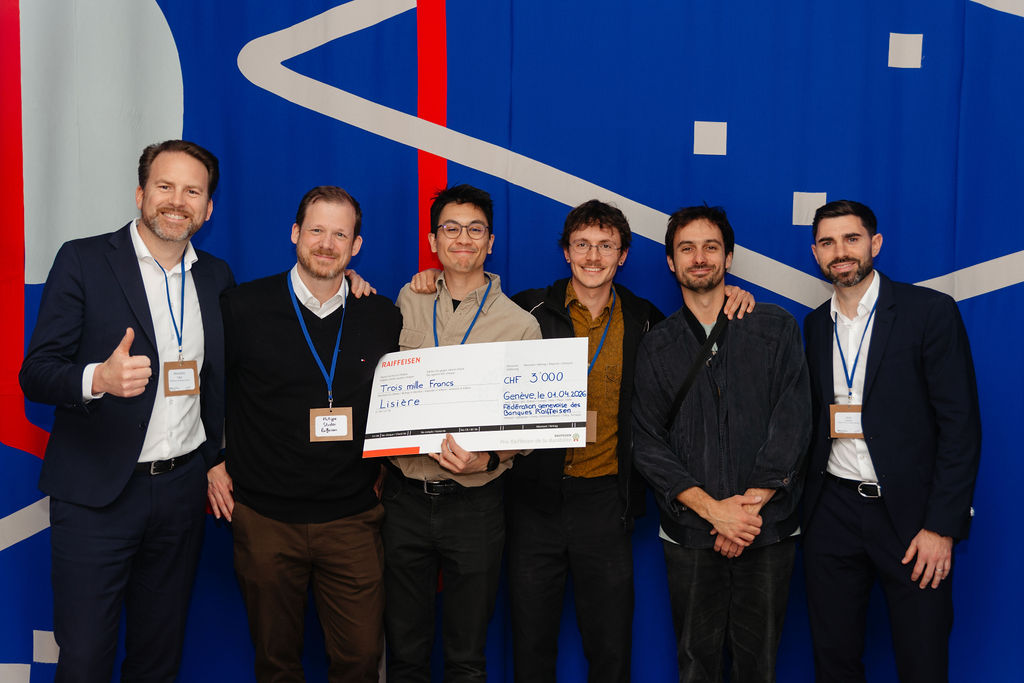 • Prix Raiffeisen de la durabilité - Smartibex AI - de g. à dr. : Karine Martirosyan (Raiffeisen), Laima Etermadi Matine (Raiffeisen), Richard Sierra & Kevin Bonga (Smartibex AI), Eric Hochwahr (Raiffeisen)
