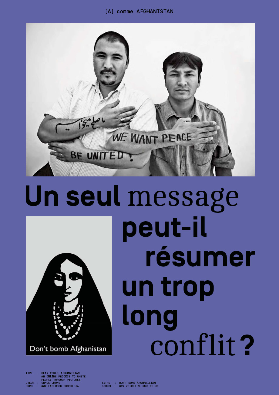 +Pour cela elle s’inspire des travaux réalisés par Ruedi et Vera Baur publiés en 2012 sous le titre Signs for Peace: An Impossible Visual Encyclopedia. Jamais utilisée dans le cadre d’une exposition, cette collection de plusieurs milliers d’images, classées par ordre alphabétique relie les termes «A comme activistes» à «Z comme Zimbabwe». Un parcours dans un monde visuel où chaque représentation fut créée en fonction d’un contexte géopolitique particulier, soit par des créateurs présents dans l’action, soit par d’autres préoccupés par l’événement et exprimant par l’image leur soutien à la cause de la paix, soit encore de manière spontanée lors d’un évènement.