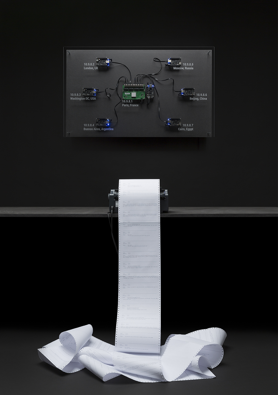 Félicien Goguey (Beauvais, 1992), média et interaction design. Le travail cohérent et engagé politiquement de Félicien Goguey a beaucoup plu aux membres du jury, notamment pour sa critique de l’actualité, avec comme toile de fonds la surveillance effectuée par la NSA. La mise en espace de son installation rend le traitement du sujet pertinent et efficace pour la compréhension des enjeux sociopolitiques.