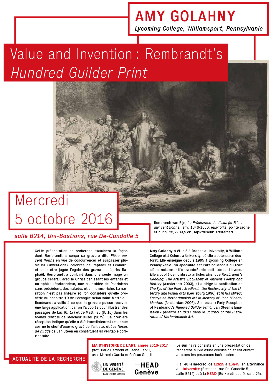Cette présentation de recherche examinera la façon dont Rembrandt a conçu sa gravure dite Pièce aux cent florins en vue de concurrencer et surpasser plusieurs « inventions » célèbres de Raphaël et Léonard, et pour être jugée l’égale des gravures d’après Raphaël. Rembrandt a combiné dans une seule image un groupe central, avec le Christ bénissant les enfants et un apôtre réprimandeur, une assemblée de Pharisiens sans précédent, des malades et un homme riche. La narration n’est pas linéaire et l’on considère qu’elle procède du chapitre 19 de l’évangile selon saint Matthieu. Rembrandt a veillé à ce que la gravure puisse recevoir une large application, car on l’a copiée pour illustrer des passages de Luc (6, 17) et de Matthieu (8, 16) dans les Icones Biblicæ de Melchior Küsel (1679). Sa première réception indique qu’elle a été immédiatement reconnue comme le chef-d’oeuvre gravé de l’artiste, et Les Noces de village de Jan Steen en constituent un véritable commentaire.