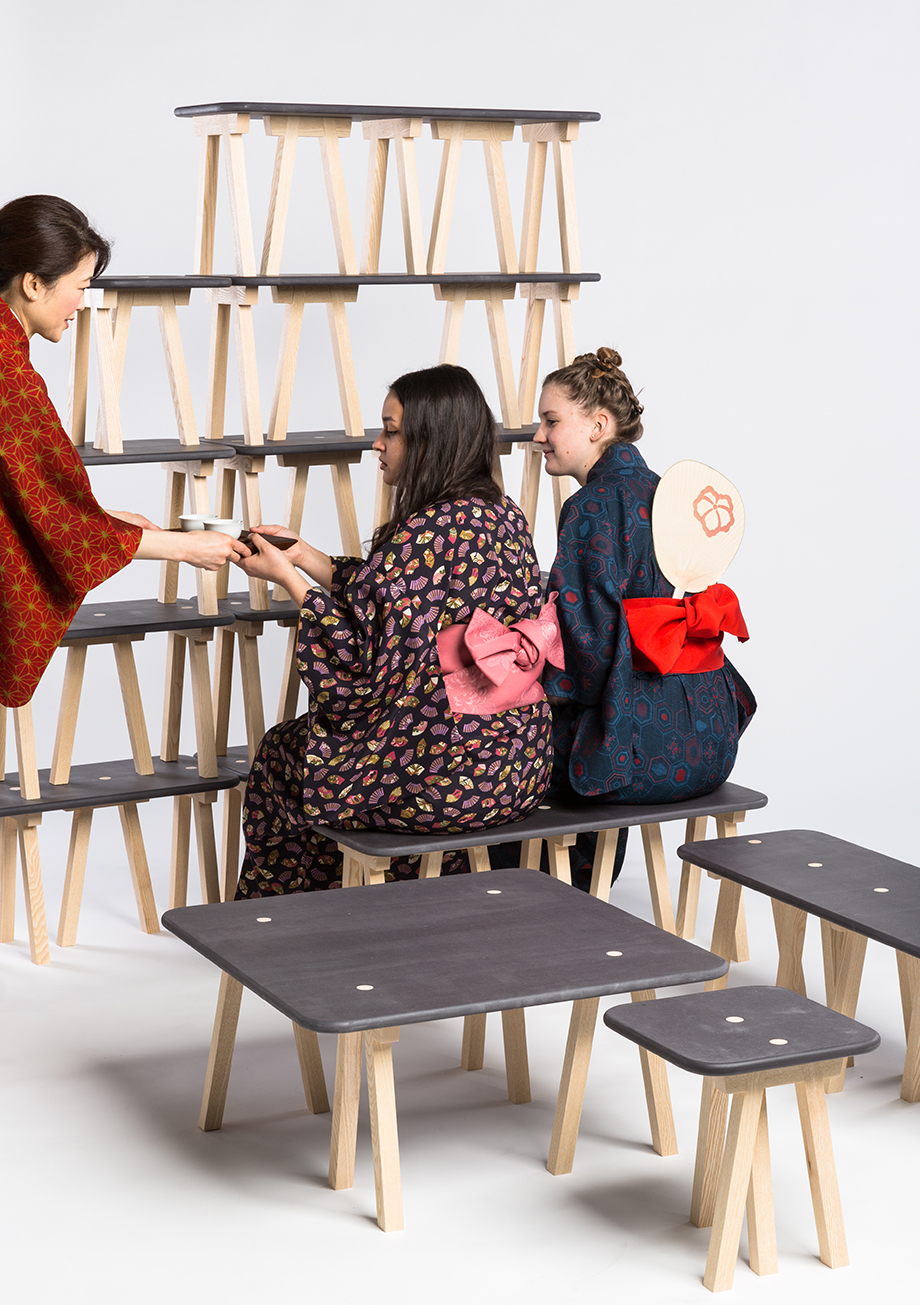 Les étudiant.e.s ont ainsi conçu 88 Pins, avec un dessin ingénieux et original pour les pieds rappelant le thème de la forêt de pins, avec une disposition asymétrique modulable au gré des besoins et de l'humeur. Quatre types de plateaux et un modèle de pieds servent à réaliser à la fois les sièges individuels, les bancs, les tables et les étagères. Une niche indépendante a été réalisée pour accueillir le chagama, la bouilloire japonaise.