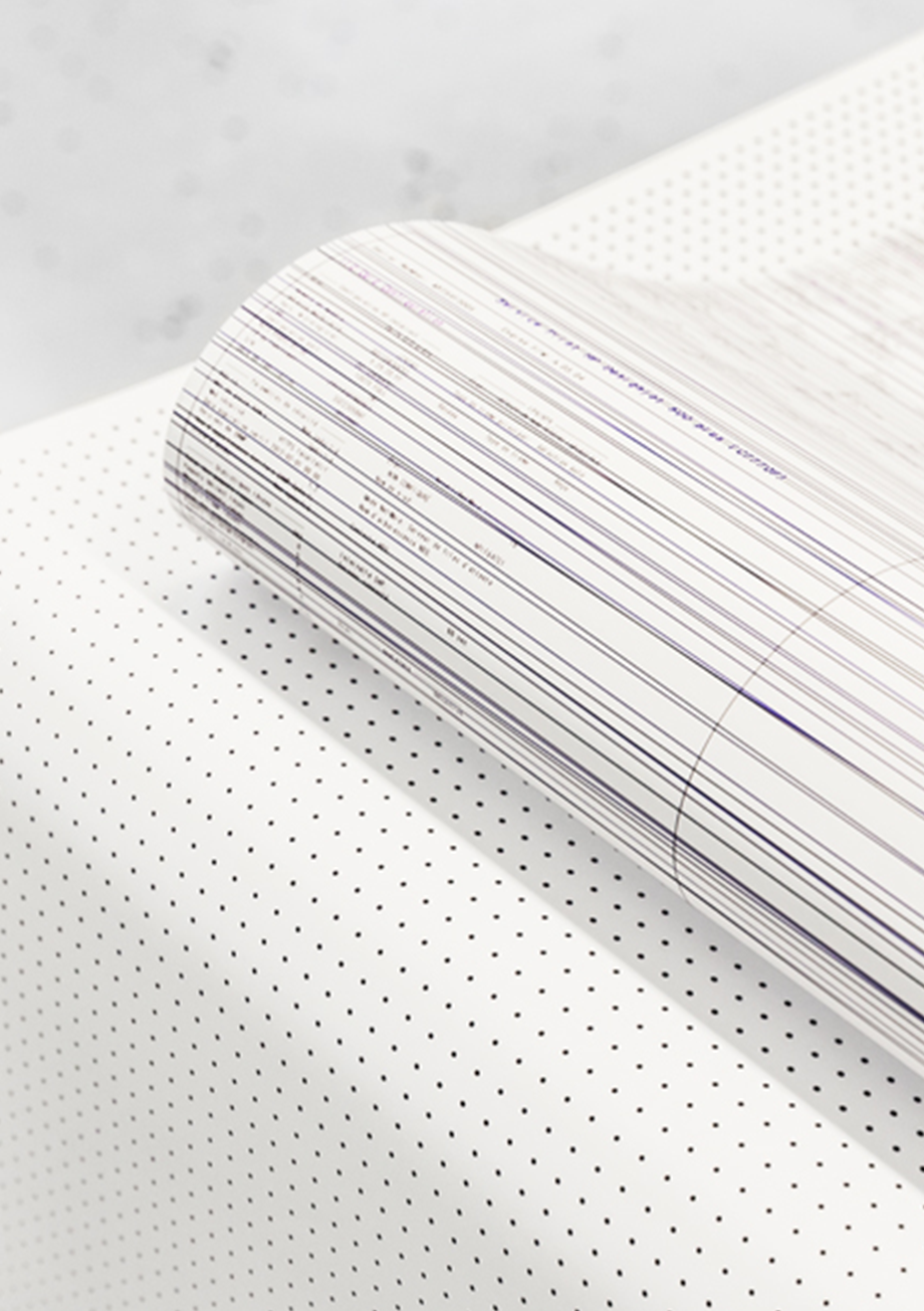 Le seul frein à l’impression perpétuelle est l’entropie du matériel. Une imprimante jet d’encre HP DesignJet 500 mise à nu, démontée, montre sa nature intérieure, fragile, faite de moteurs, de câbles et de parties mécaniques. Les fonctions primaires sont inversées. La machine ne produit pas une seule page à la fois, mais un flou d’impression sur une surface en boucle, créant ainsi un écran en mouvement de 8 m2. Le système de gestion du papier, les capteurs, et les cartouches ont été hackées par un travail qui défie le processus industriel. Un algorithme alimente son geste, minimal et réduit à l’essentiel: une ligne horizontale. Le bruit devient ligne, la ligne devient son, le temps les transforme en musique concrète. Le signe fragmenté, s’imprime sans pause, se surimprime, et génère une composition aléatoire en perpétuelle mutation.