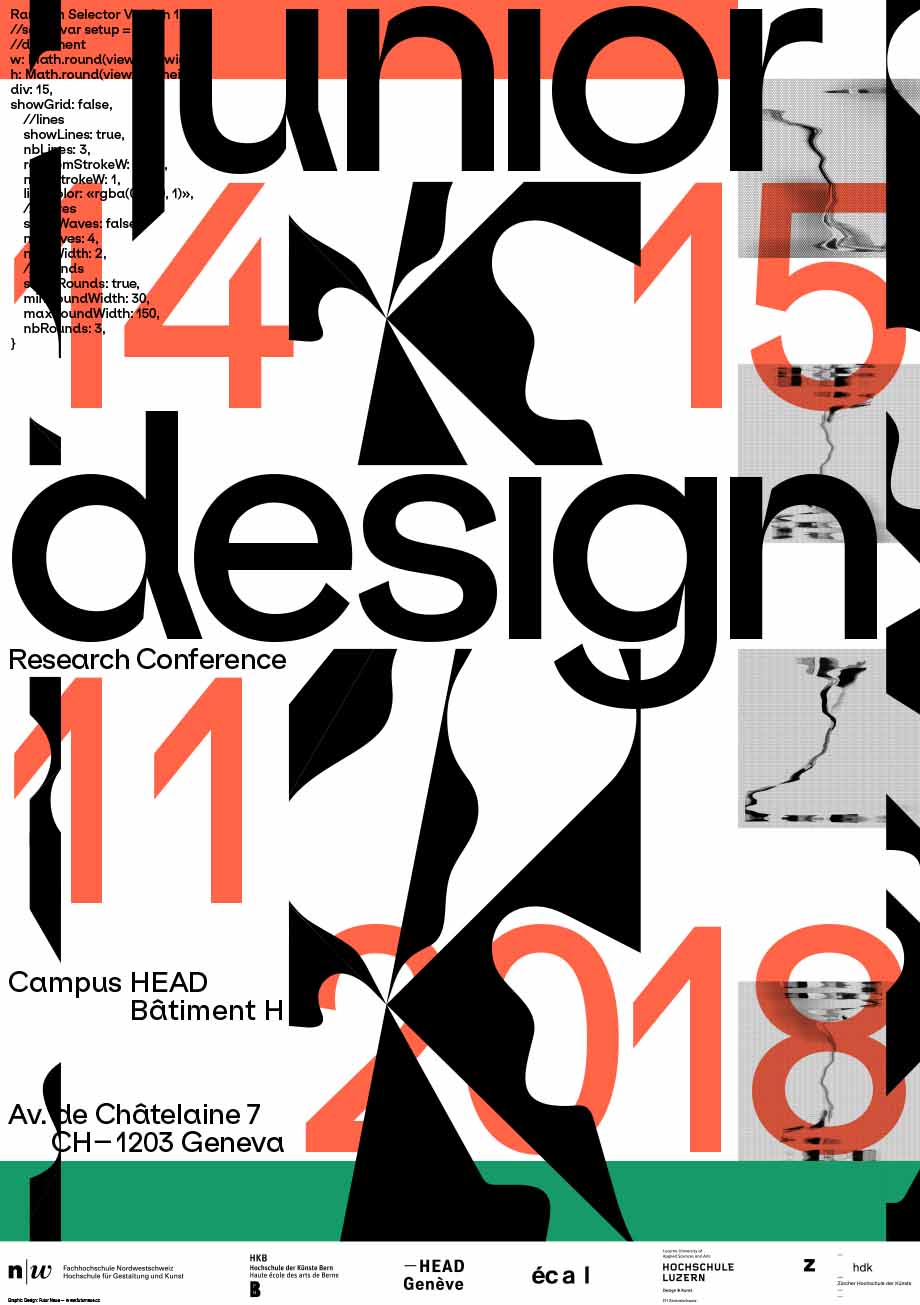 The Junior Design Research Conference will be held this year at HEAD – Genève on November 14 and 15. This annual conference is organised by all the Swiss Universities of Art and Design. The objective is to present the different pedagogical approaches and to allow students to meet and exchange. The afternoon of the 14th will be devoted to the presentation of organizations supporting design and art research and research projects carried out by alumni. On November 15, a dozen students from the 6 universities will present their master's projects, and workshops to deepen the morning presentations will be held in the afternoon.
