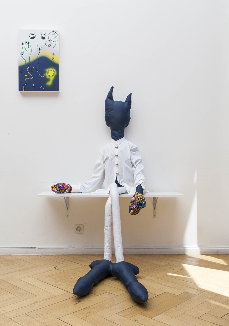Intitulée ShowDown, l’installation de Thomas Liu Le Lann (1994) plonge le visiteur dans une fiction élaborée par l’artiste au cours de ses études. Il y met en scène de grandes peluches désarticulées tout droit tirées d’un manga japonais ou encore de l’univers visuel de la K-pop sud-coréenne. Ces « soft-sculptures » en tissu, disposées à même le sol, évoquent une certaine lassitude et brouillent les codes en mêlant fétichisme, violence et robotique, à des références de la culture populaire plus édulcorées.