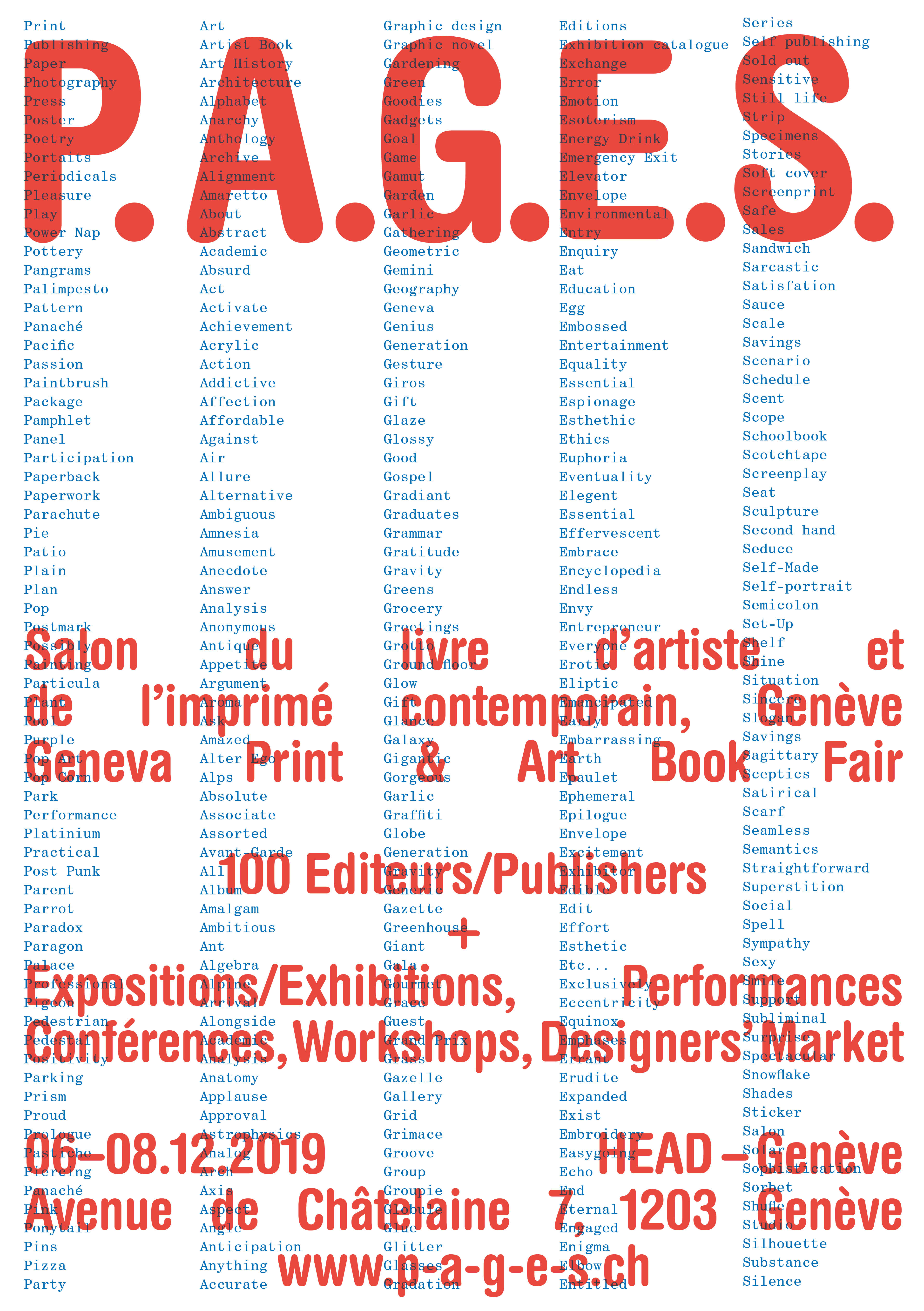 P.A.G.E.S est une plateforme où l’on pourra se procurer des publications d’art et de design, des tirages de tête, fanzines, affiches, multiples, bandes dessinées, magazines, journaux, éditions limitées et autres objets imprimés. En parallèle, des conférences, ateliers, performances et signatures seront proposés durant les 3 jours. Dans la Design Room, attenante au Cube, le MAMCO (Musée d’art moderne et contemporain, Genève) nous fera découvrir une sélection d’ouvrages et de multiples édités par Claude Givaudan. Le salon accueillera également le marché des designers de la HEAD où l’on trouvera créations, accessoires, mobiliers, objets, vêtements et pièces uniques.