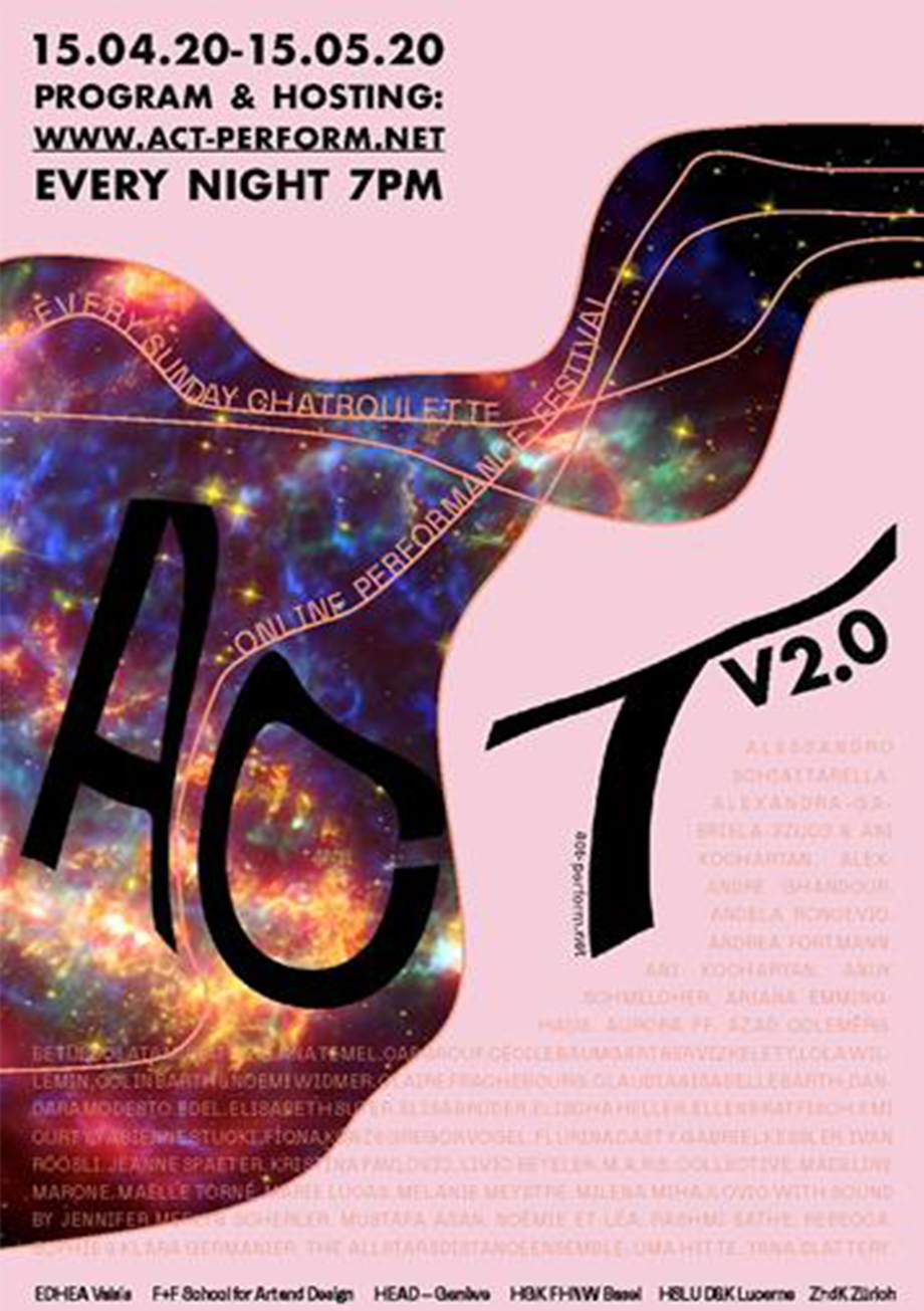 En raison de la situation actuelle, ACT 2020 devient un festival de performances en ligne : ACT v2.0. La HEAD y participe de manière active avec son Département Arts visuels et son option Art / action. Avec les étudiantes Marie Lucas, Emi Curty, Madeline Marone, Edel, Uma Hitte.