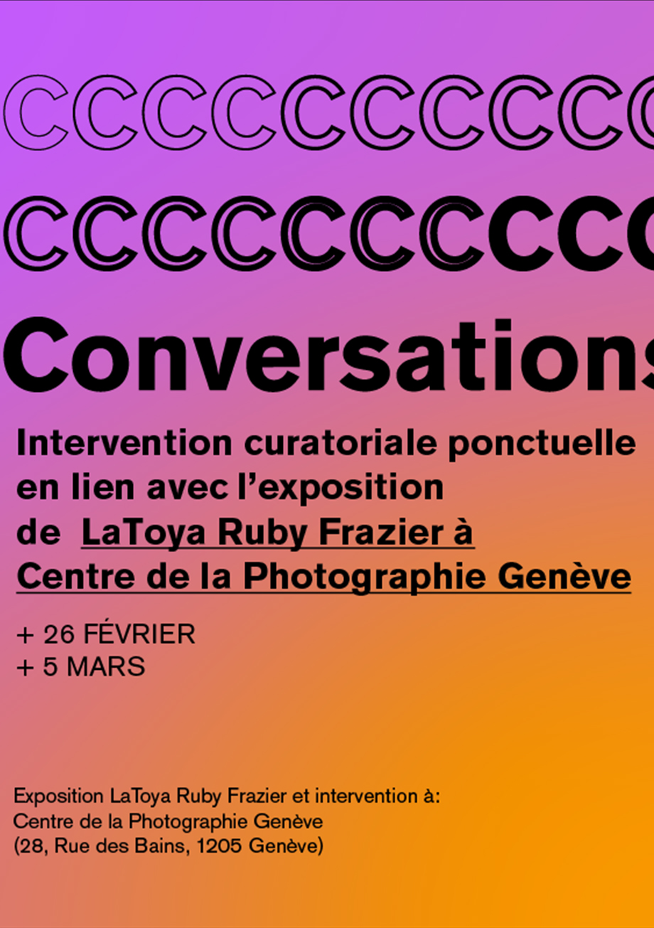 Thursday 5 March, 7pm, CPG exhibition space: CCConversation with Peggy Perriot, writer, activist, and researcher lives and works in Brussels, reflecting on the works by LaToya Ruby Frazier on display at CPG. In her practice, Peggy Perriot is involved in projects linking information, media, activism, radio art, and technology. She worked as a radio-journalist and as a technical webmaster in media and non-profit projects. She lectures on writing, technology, African-American culture, and science-fiction. She is working with A.Pass and Erg (École de Recherche Graphique) in Brussels and is rethinking les Ateliers des horizons (ex-ecole du magasin, Grenoble, France) together with Le Magasin team. Her current project is Maskenfreiheit.