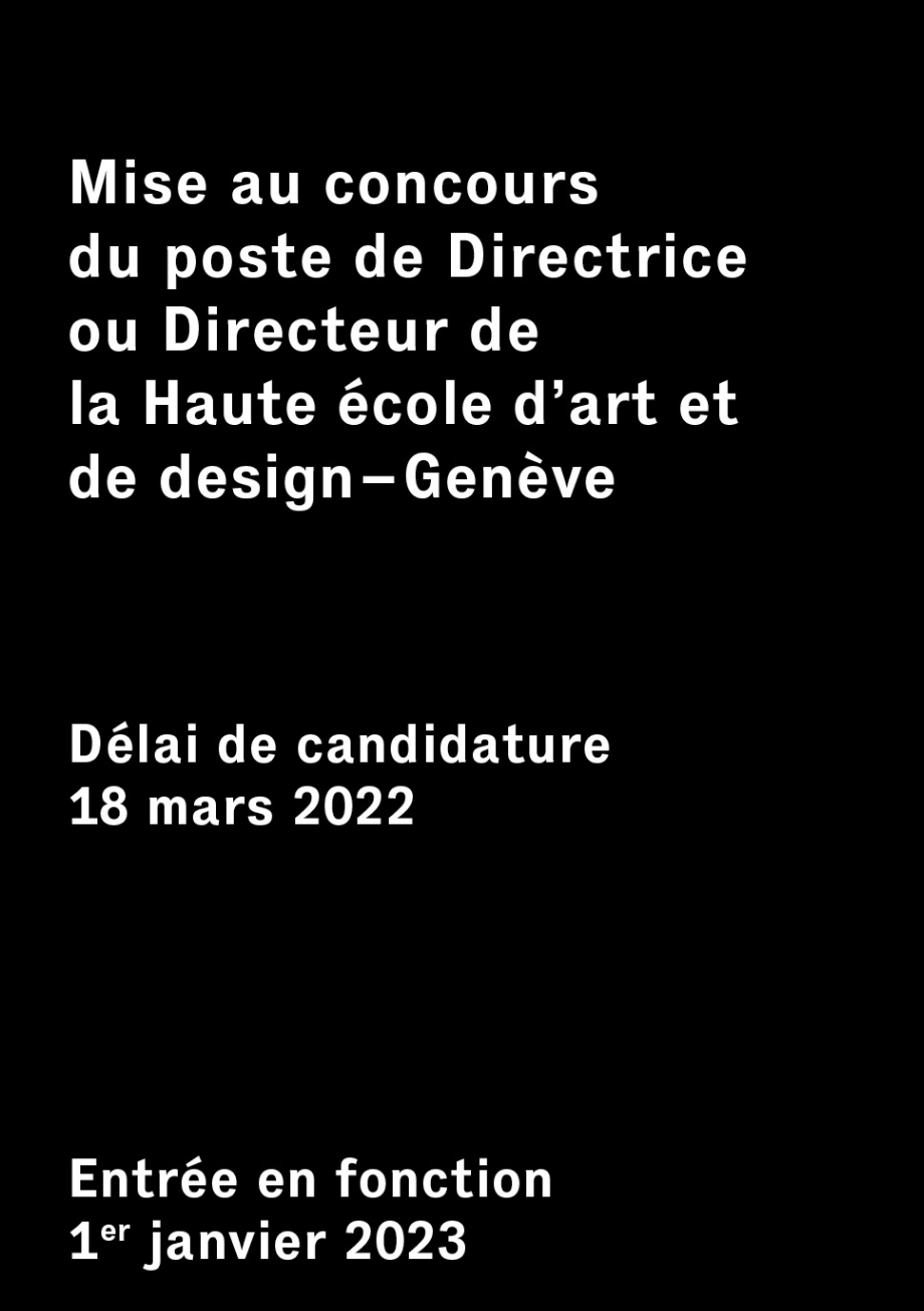 The future director, will be required to offer a vision of art, film and design, its teaching and its new fields of application, which will then be implemented in the school’s goals, i.e. basic training, continuing education, artistic research and the provision of services. They will be responsible for rallying the teaching and administrative teams around an ambitious school project that responds to current artistic, design and societal issues thereby developing close relationships with cultural and academic institutions, as well as with the economic fabric, at local, national and international levels. Mindful that HEAD remains a recognised player in regional cultural life, they will work to promote its activities and ensure their visibility. Responsible for the educational, artistic and administrative management of the school, they will ensure participative governance, coherent organisation and optimal allocation of resources, both human and financial. They will represent the school at cantonal and inter-cantonal level, particularly within the domain of HES-SO’s Design and Visual Arts. Finally, as a member of the HES-SO Genève Board of Directors, they will actively contribute to the definition and implementation of the school’s strategy, in a spirit of collegiality and complementarity.
