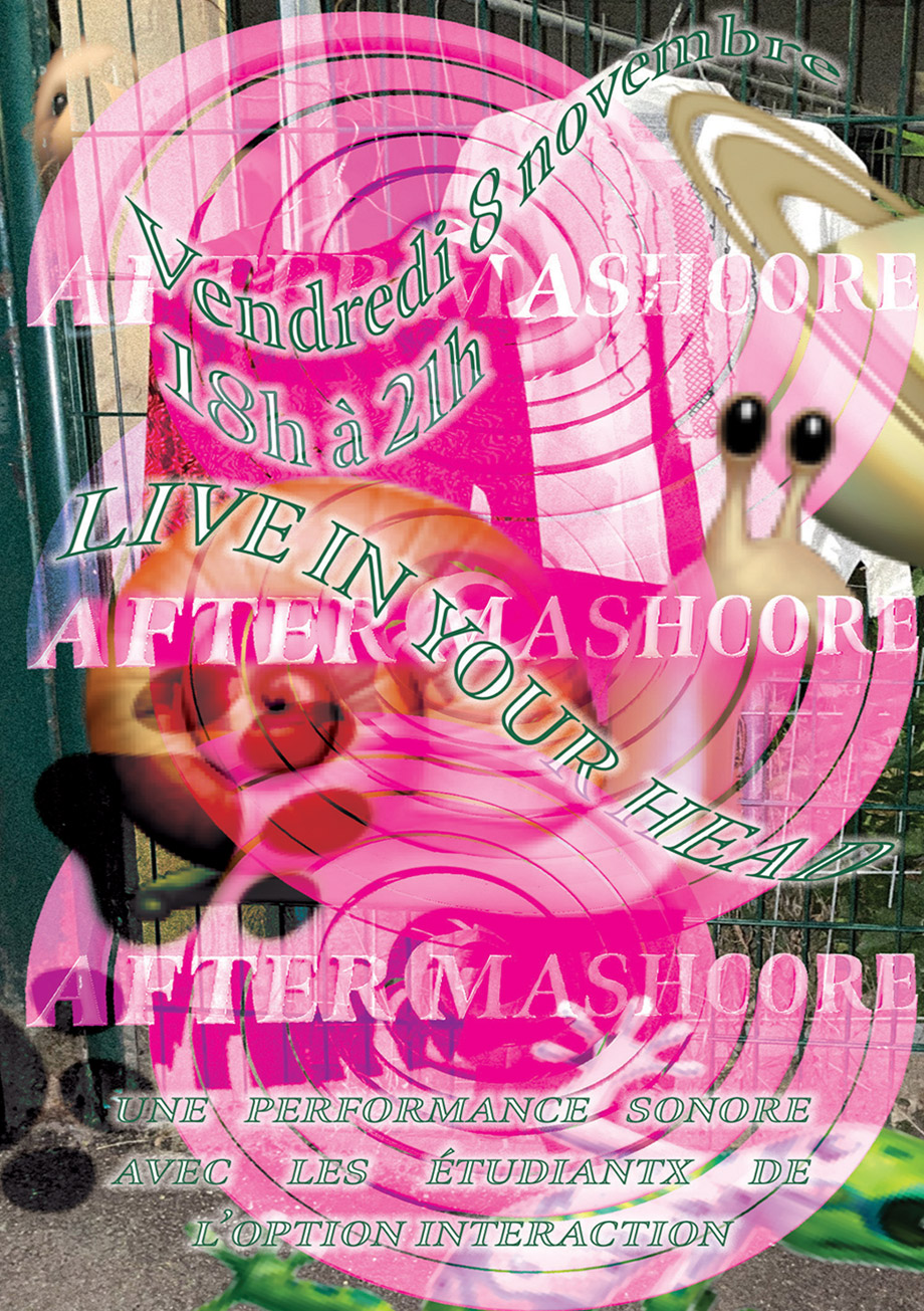 AFTER MASHCORE est le résultat d’une recherche commune de l'option [inter]action après quelques jours d’écoute et de production sonore. La méthodologie empruntée sera si besoin incohérente et notre structure chaotique pour explorer cette présentation sonore, son dispositif de diffusion, l'acoustique de l'espace ou l'écriture d'une partition spatialisée pour enfin, trouver un core qui nous convient.