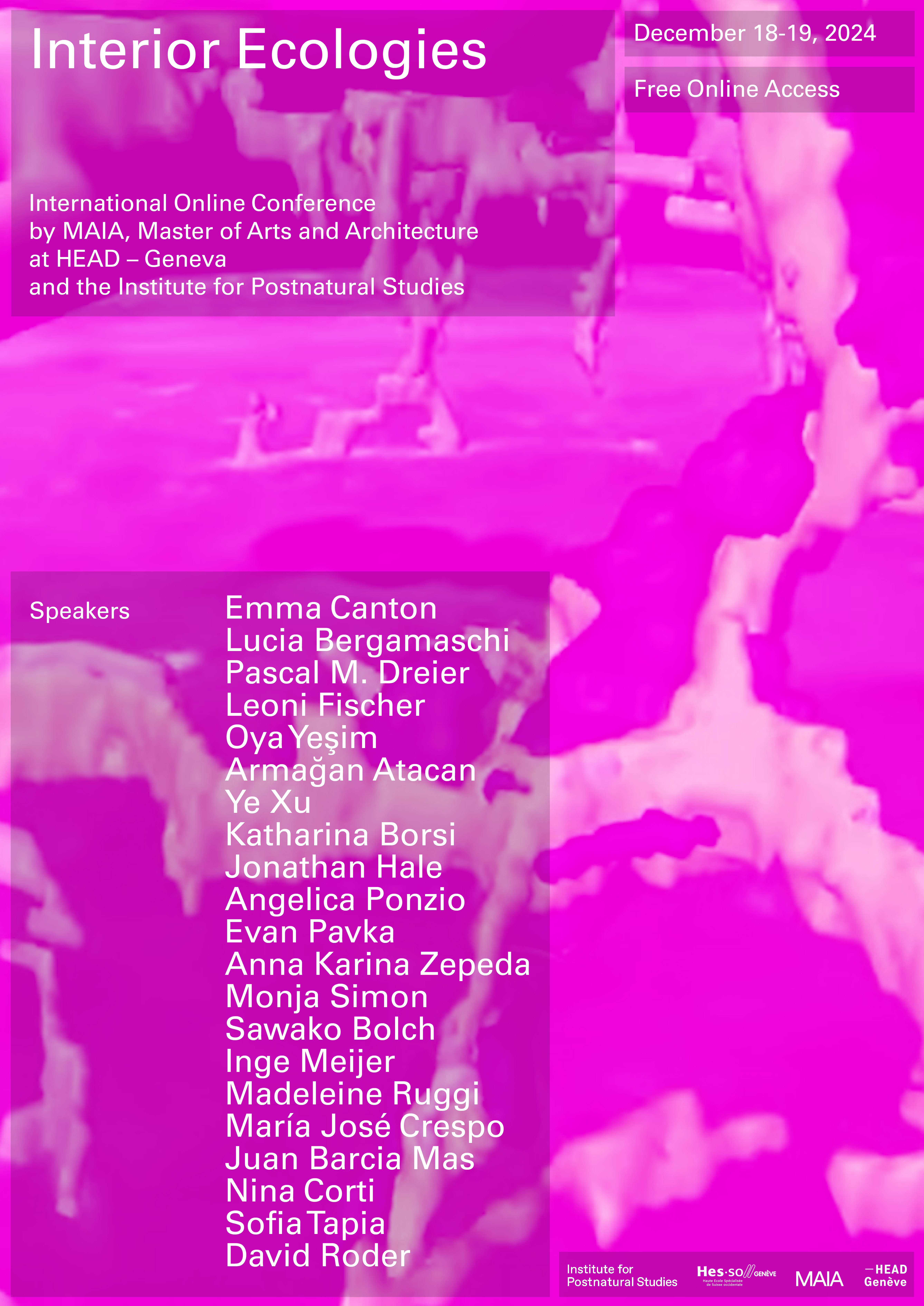 The third edition of the Interior Ecologies conference, organized by MAIA, Master of Arts in Interior Architecture at HEAD – Genève, and the Institute for Postnatural Studies, will address porosity and interiority as frameworks for contemporary architectural thinking. By questioning “what is interior” and “where is interior,” the symposium will enact a discursive virtual space to explore the possibilities of interior architecture as an interface. By approaching indoor space as procured through the intermingling, interacting, and exchanging of diverse elements, the symposium will consider the role of media, technology, and expanded ecologies in rendering “interior” as a relative projection.