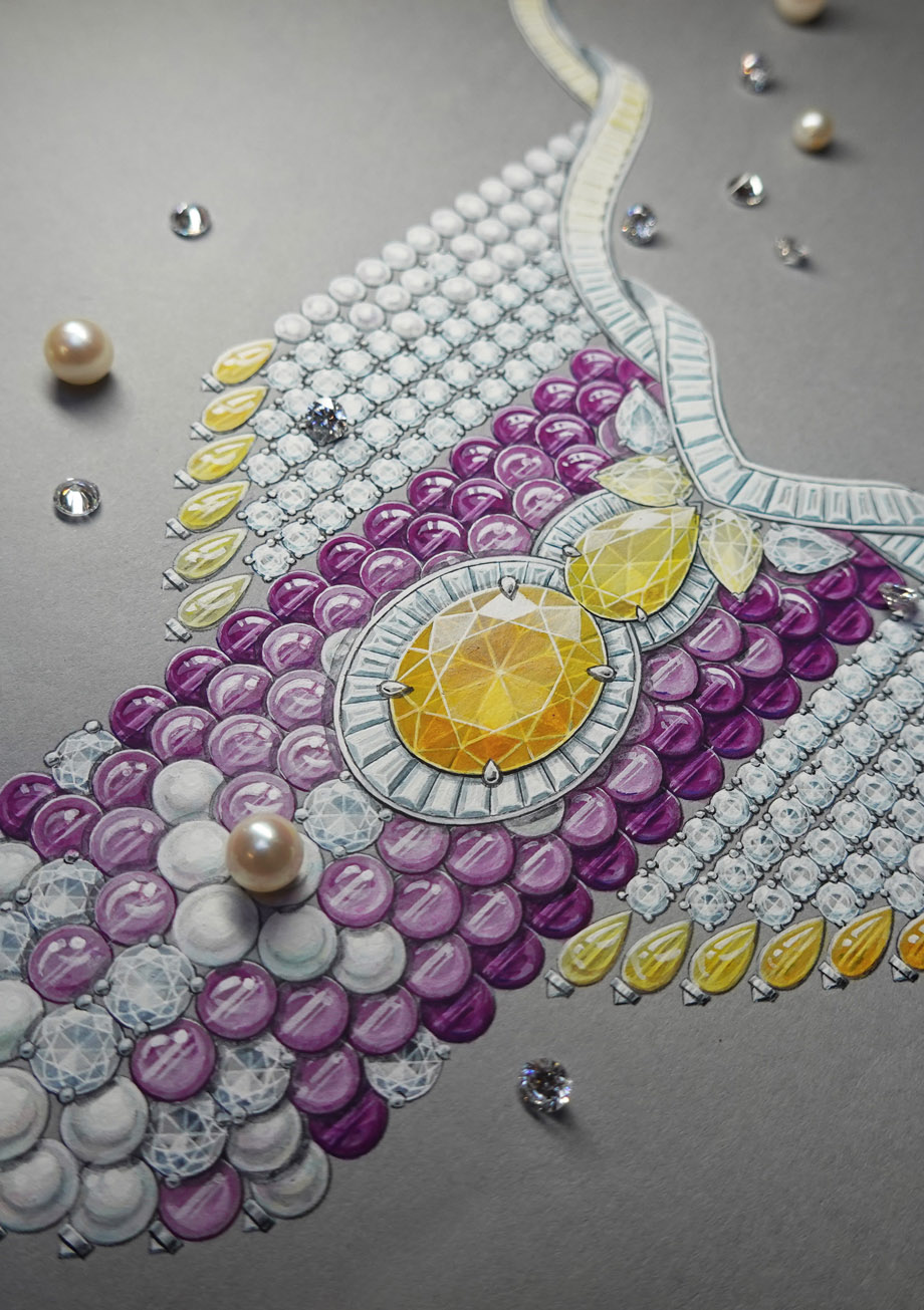 A gouache artist and designer, Estelle creates her High Jewellery and Watches gouaches with infinitesimal precision, transforming the colours of Linel into genuine jewels on grey paper.