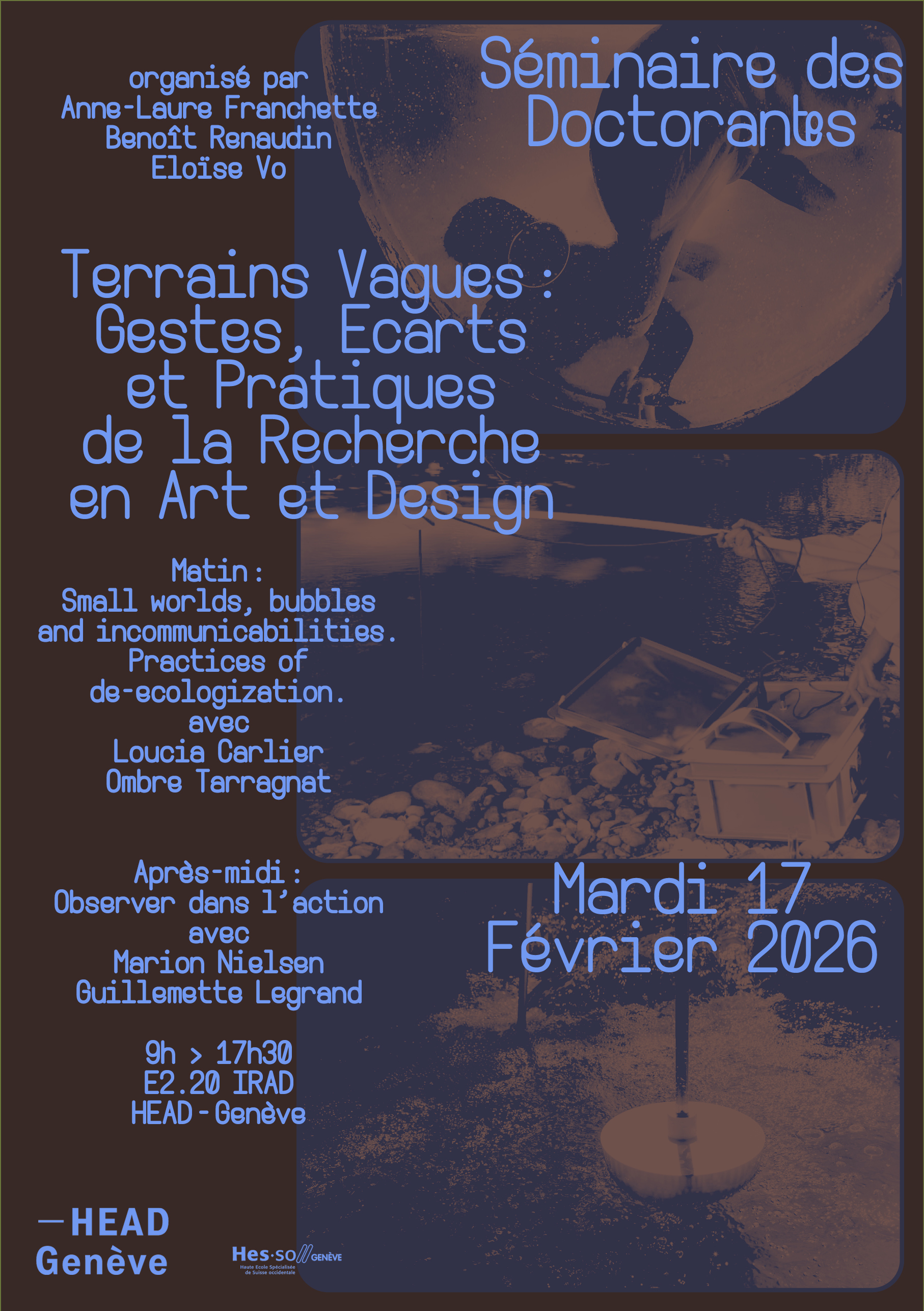 Organized by doctoral students at HEAD – Geneva, this doctoral seminar offers a space for discussion and exchange around experimental methods in art and design research. Conceived as an open laboratory, it encourages transdisciplinary, critical and speculative approaches, exploring forms and practices that shift traditional academic frameworks.