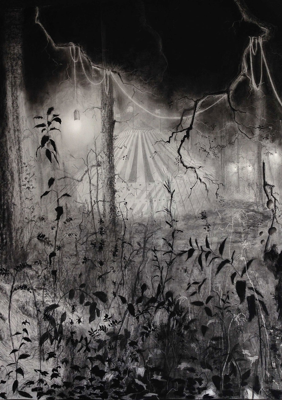 Silent Circus, 150x280 cm, 150 x 280 cm, fusain, graphite et encre