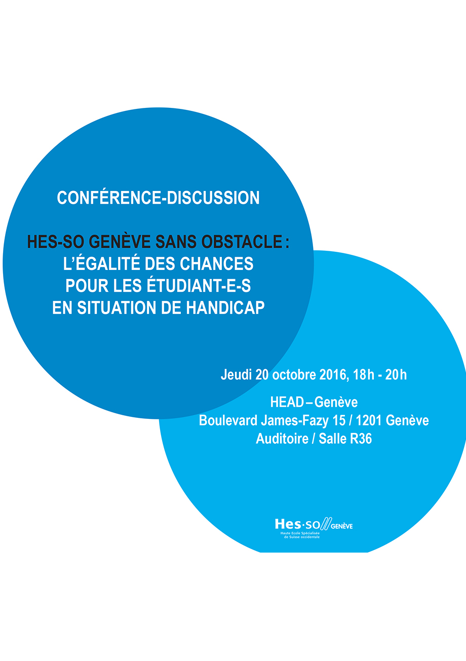 Le service Égalité des chances de la HES-SO Genève a le plaisir de vous inviter à cette conférence-discussion, elle a pour objectif principal de présenter le dispositif transversal de la HES-SO Genève en matière d’accueil et d’intégration d’étudiant-e-s en situation de handicap et ayant des besoins spéciaux.