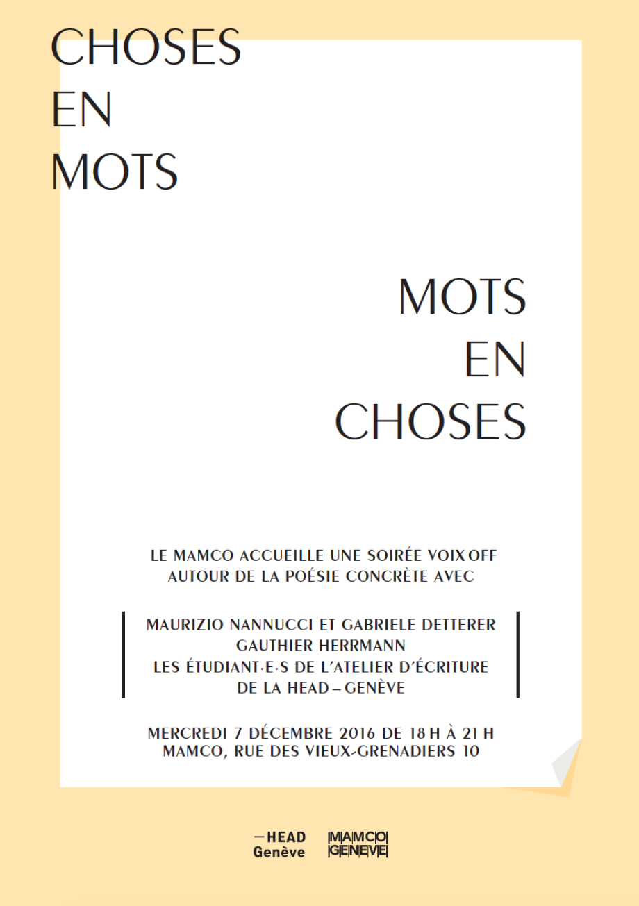 VOIX OFF est un rendez-vous de l’Atelier d’écriture de la Haute Ecole d’Art et de Design – Genève. A un rythme régulier, l’Atelier se déplace et invite un auteur (artiste, écrivain, poète, éditeur, traducteur) à donner une lecture publique. Ce moment, pensé comme un mode singulier de l’expérience d’une voix, vient élargir le spectre des situations de transmission mises en oeuvre dans l’Atelier autour des pratiques de l’écriture.