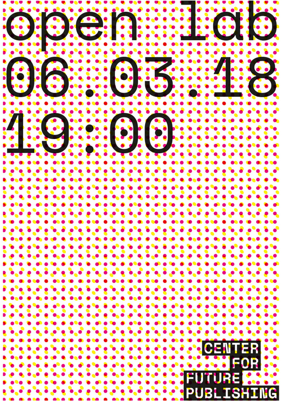 Les soirées open lab sont conçues pour créer le débat autour des notions de publication transmédia et post-numérique. Le Center for Future Publishing est une association sans but lucratif qui a comme mission de pousser les limites du travail graphique grâce aux nouvelles technologies et à une approche transdisciplinaire.