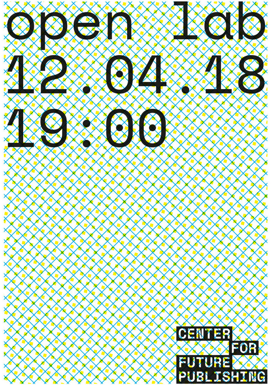 Les soirées open lab sont conçues pour créer le débat autour des notions de publication transmédia et post-numérique. Le Center for Future Publishing est une association sans but lucratif qui a comme mission de pousser les limites du travail graphique grâce aux nouvelles technologies et à une approche transdisciplinaire.