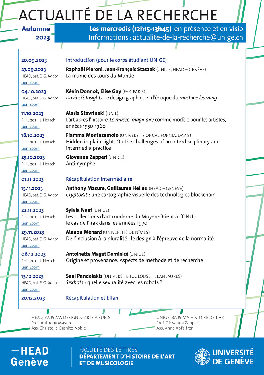 Depuis plusieurs années, la HEAD – Genève et le département d’histoire de l’art de l’UNIGE proposent un cours commun prenant la forme d’un cycle de conférences en art et design ouvertes au public, en présentiel et en ligne. Les thématiques et périodes traitées sont variées et couvrent les différents champs de recherche des deux institutions