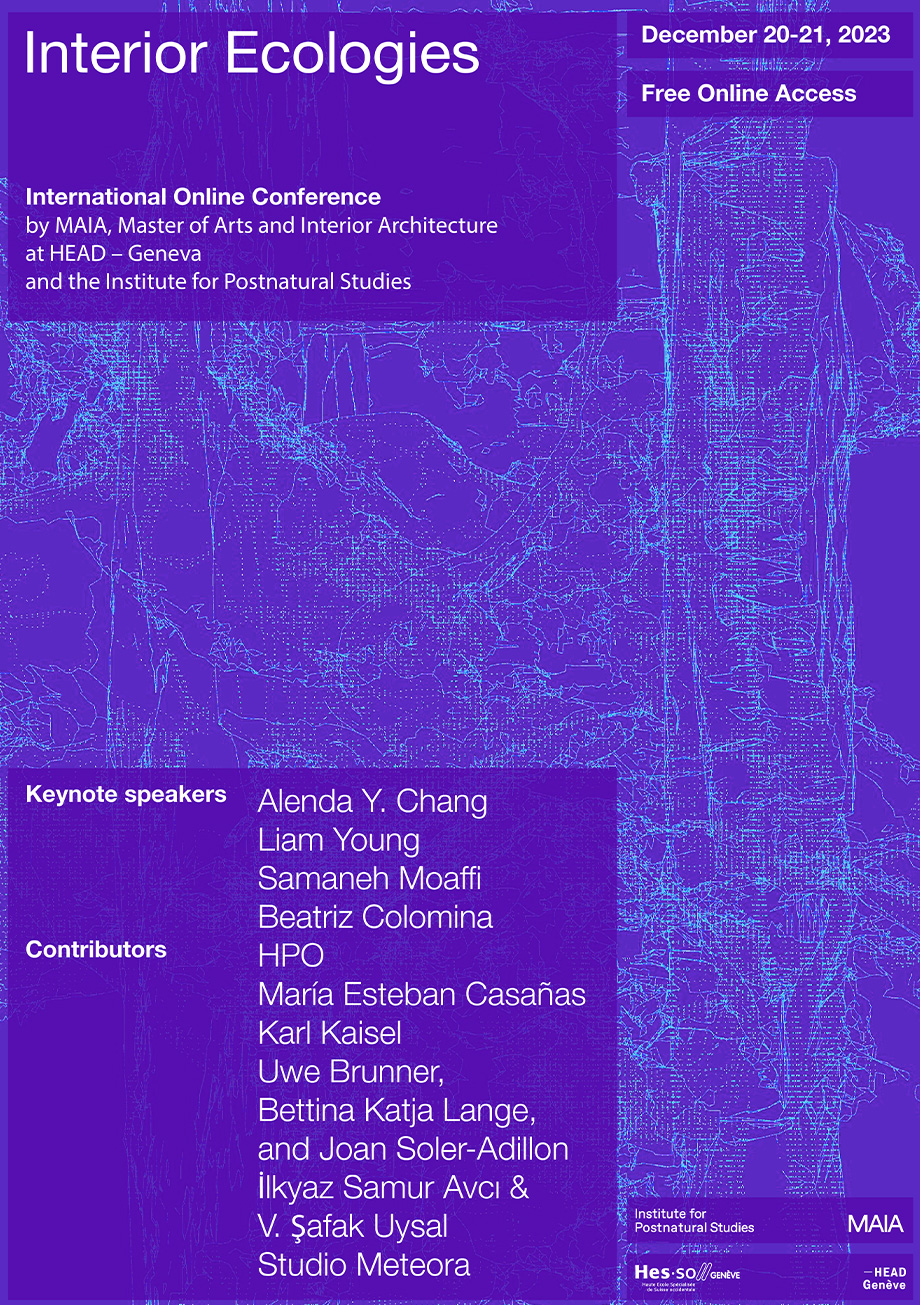 The second edition of the Interior Ecologies conference, organized by MAIA, Master of Arts in Interior Architecture at HEAD – Genève, and the Institute for Postnatural Studies, will delve into the intersection between the built environment and new emerging ecologies. It will explore the impact of digitalization on interior architecture and its relationship to computational ecologies, social media, non-human relations, postnatural territories, video games, and artificial intelligence.