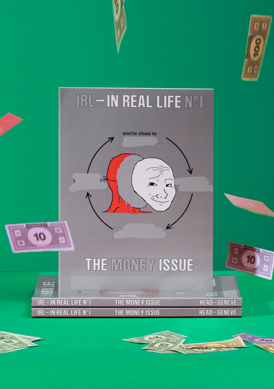 À l'image des interviews, la proposition d'Émilie Ferrat nous parle de son rapport à l'argent et de sa propre réalité économique. Sa proposition graphique fait dialoguer des images de mèmes internet existants avec de vrais documents financiers et administratifs qu'elle dévoile en toute transparence. Aussi viraux et populaires que l’argent, les mèmes permettent d'aborder avec humour des sujets complexes et tabous. En travaillant cette culture numérique subversive, Émilie crée une relation circulaire entre le titre de la revue IRL, le sujet de ce premier numéro et les problématiques qu’elle aborde.