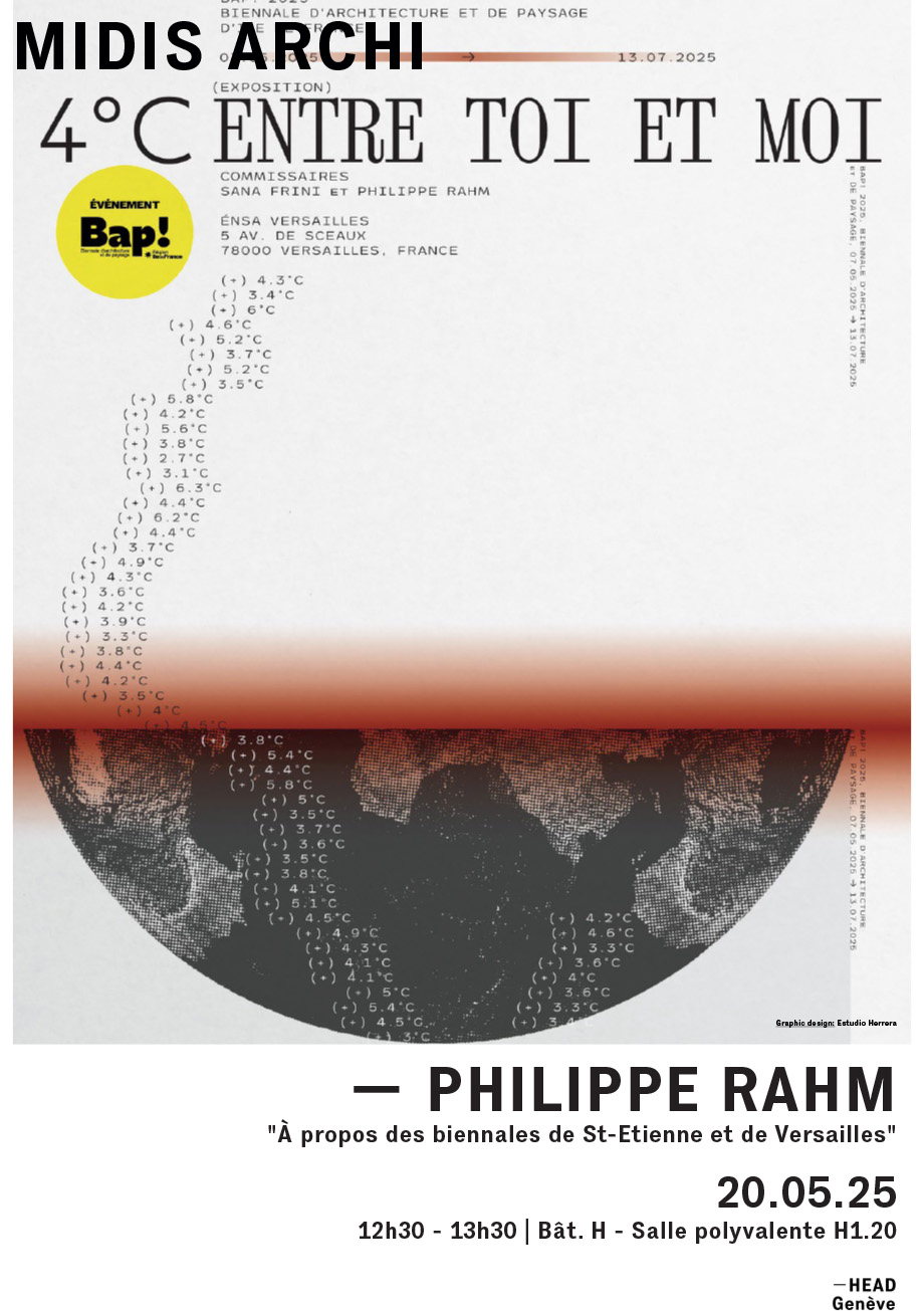 Dans le cadre du cycle de conférences MIDIS ARCHI, vous êtes cordialement invité par le département architecture d'intérieur de la HEAD – Genève à assister à la conférence en français de Philippe Rahm à propos des biennales de St-Etienne et de Versailles auxquelles participent les étudiant.e.s de la HEAD qui aura lieu le mardi 20 mai 2025 de 12h30 à 13h30.