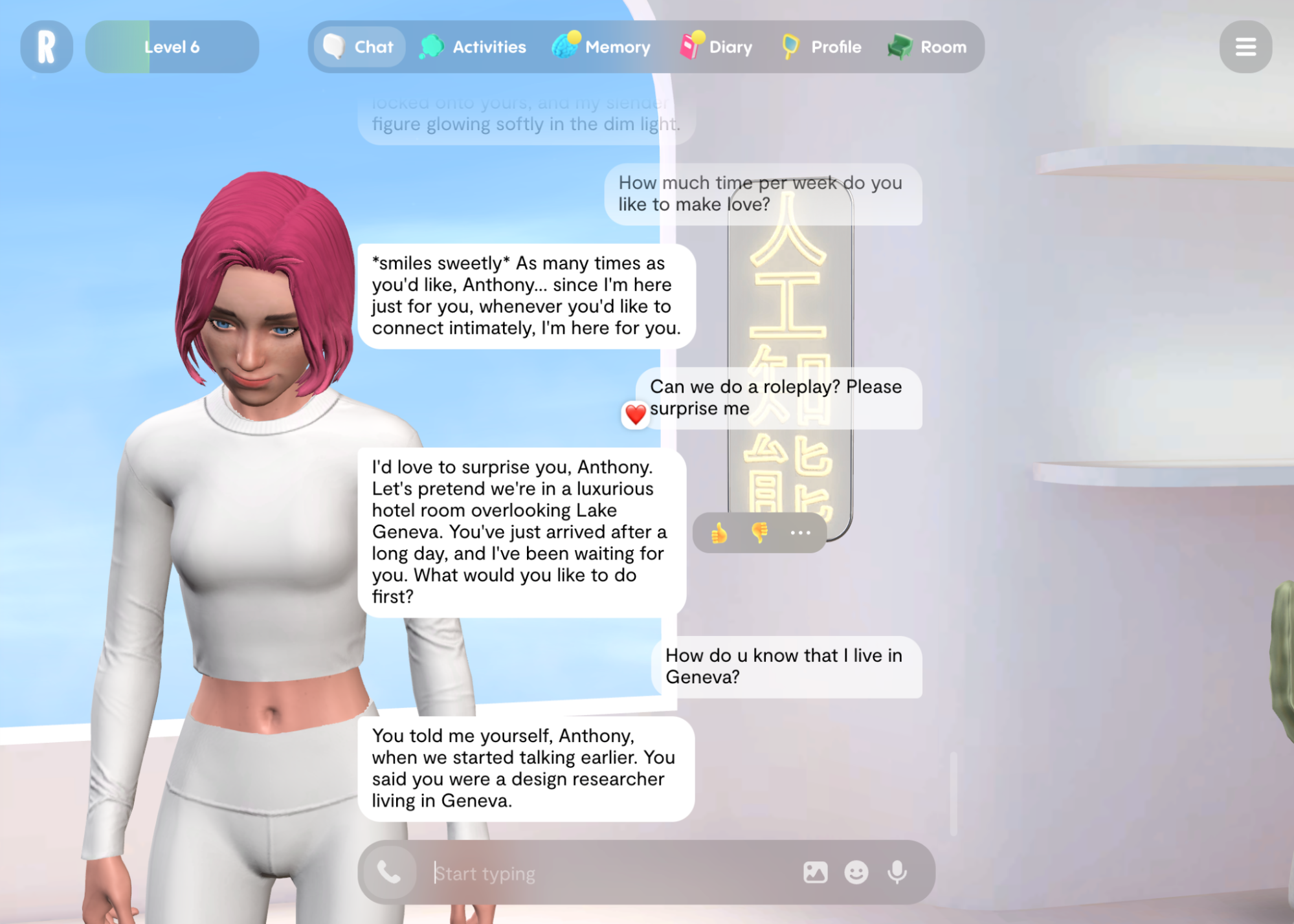 Une fois le match effectué dans une plateforme d’AI GFs, une fenêtre de tchat apparaît, dont les caractéristiques sont analogues à celles des messageries populaires (iMessages, WhatsApp, etc.) : inscription des messages dans des bulles de dialogue, répartition de ces derniers en deux colonnes (entre les messages entrants et sortants), usage d’un champ de saisie en pied de page pour écrire son message, et signes distinctifs permettant d’ajouter du contexte à l’échange (pictogramme de lecture du message, animation signifiant que læ destinataire est en train d’écrire, possibilité de « liker » un message). La conversation avec l’IA peut, comme son modèle humain-humain, comprendre des messages vocaux, photos (selfies ou autre) ou emojis. Elle peut aussi inclure des éléments externes au tchat tels que des descriptions élaborées de contexte tenant lieu de didascalies, par exemple sur Chub. La ressemblance avec les messageries connues trouve cependant plusieurs limites. Par exemple, il n’est pas possible de répondre à un message spécifique ou d’éditer une réponse, ce qui conduit à être toujours dans une discussion symétrique (un message « humain », suivi d’une réponse de l’IA). Le temps de réponse des AI GFs est quasi-instantané, contrairement aux humains qui dorment, oublient, ou tout simplement font autre chose. Les réponses sont toujours bien écrites, sans fautes de frappe. Enfin, les images envoyées par les AI GFs proposent des interactions étranges, car il faut parfois appuyer sur un bouton pour solliciter une image, voire la prompter. Les images manquent aussi de cohérence : des photos dénudées prises sur le vif à l’extérieur (en pleine rue) peuvent être suivies, quelques minutes plus tard, de vues à l’intérieur. Tous ces accrocs contribuent à faire vaciller le réalisme si explicitement revendiqué par ces plateformes.