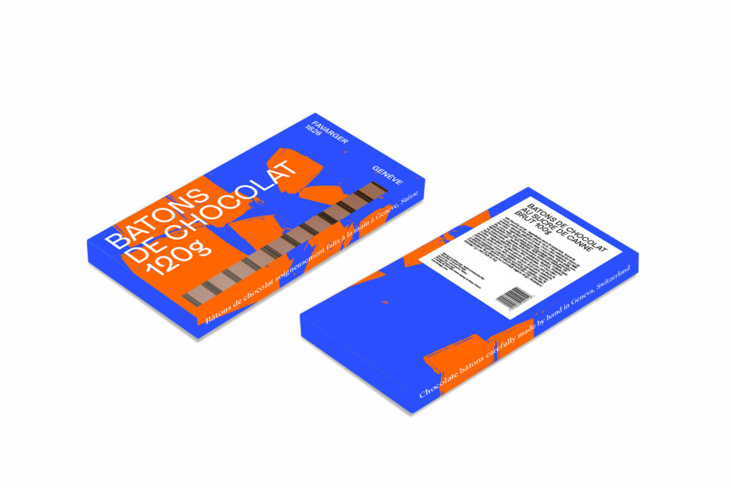Sept groupes de deux, trois ou quatre élèves ont imaginé une série de propositions pour moderniser l’identité de la marque de chocolat genevoise. Le projet retenu de Fanny Alvarez, Loraine Friedli, Elsa Hoover, Jordane Vincenzi a séduit la direction de la marque pour ses parti-pris de couleurs fraîches et contrastées, sa typographie de la famille « grotesque » aux racines helvétiques égayée d'ornements organiques ou encore sa mise en avant astucieuse de la date de fondation de la société. Le concept visuel de la plaque de chocolat concassée a plu car il renvoyait à l'image du chocolat en vrac ou fait à la main que Favarger veut valoriser. Suffisamment novateur pour attirer de nouveaux et jeunes regards, tout en restant accessible à une clientèle traditionnelle, le projet correspondait largement aux attentes de la marque. L'entente était telle entre les quatre graphistes, qu'elles ont décidé de continuer à travailler ensemble à la sortie de l'école. Anette Lenz tient à préciser que chaque projet possédait des qualités et des idées intéressantes. « Nous encourageons les étudiant·exs à développer leur langage et leur approche visuelle afin que chacun·e trouve son identité personnelle. » Citons par exemple, un concept inspiré par les Furoshiki, l'emballage traditionnel japonais en tissu par Lily Grangier et Pauline Riegler ou des tablettes habillées tels des tableaux des éléments chimiques jouant sur les carrés et la matière première par Adam Chatir, Belinda Thimotée, Chiara Preiswerk et Mélanie Berger.