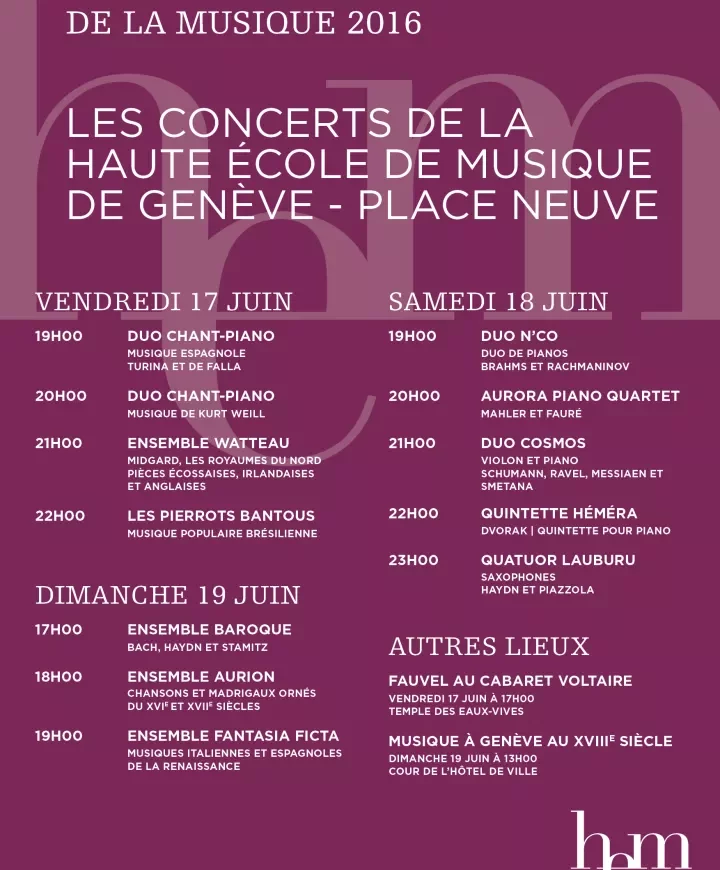 La HEM – Genève s’associe à la Fête de la musique et présente de nombreux concerts de tous les temps et de toutes les formations à la Place Neuve.