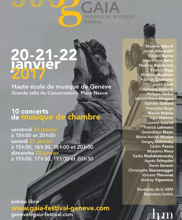 Pour sa 2e édition, le GAIA-Festival réunira environ 80 musiciens, professeurs et étudiants de la HEM, pour une dizaine de concerts de musique de chambre.