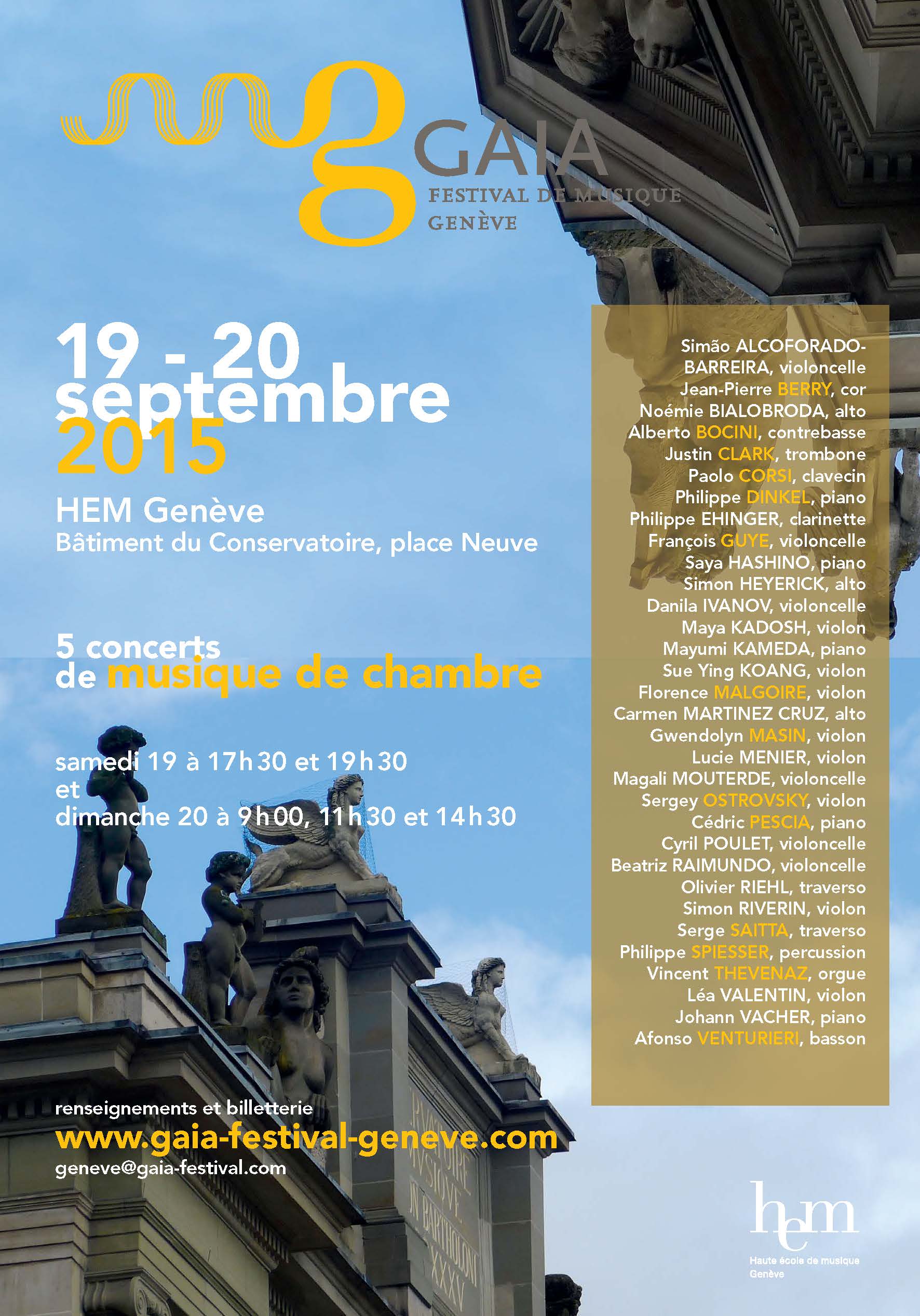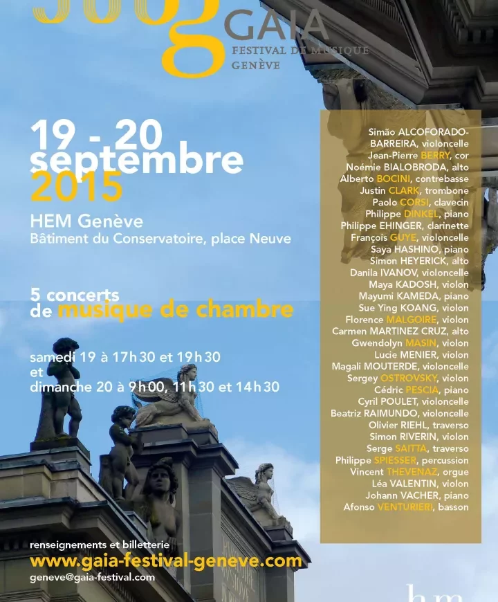 Pour sa 1ère édition, le Gaia Festival réunira une vingtaine de musiciens, professeurs et étudiants de la HEM – Genève, pour 5 concerts sur 2 jours de musique de chambre.
