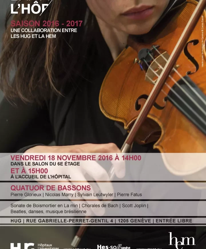 Musique de chambre jouée par des petits ensembles d'étudiants de la Haute école de musique de Genève au fil des mois dans différents lieux des HUG.