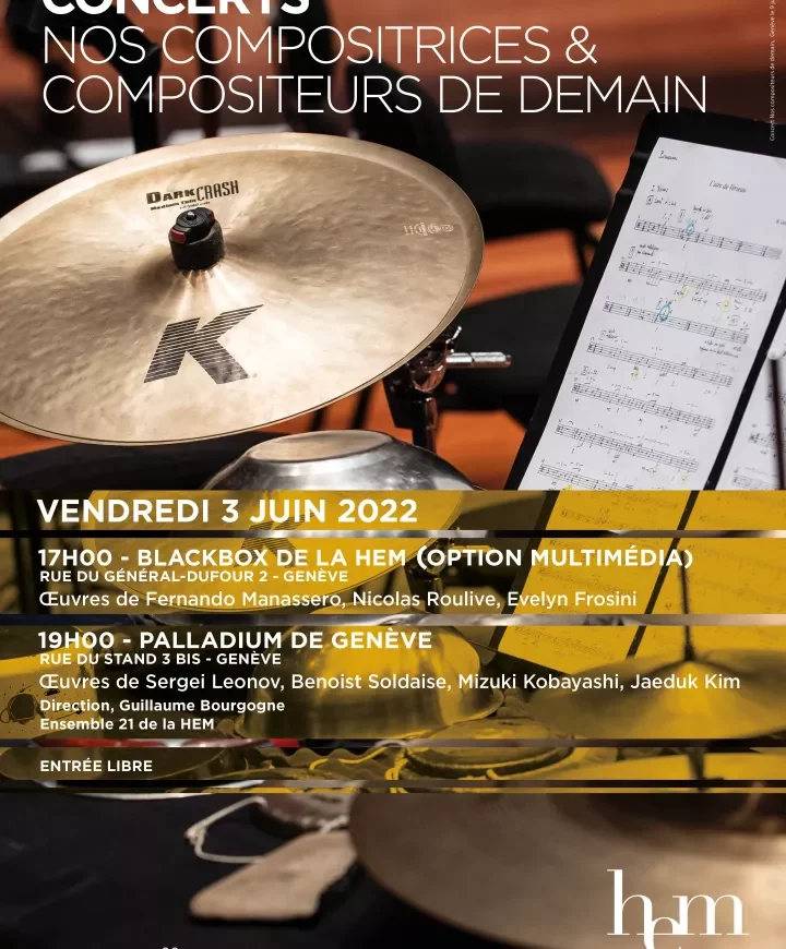 Pièces des étudiant·e·s des classes de composition et composition mixte de la Haute école de musique de Genève : Benoist Soldaise, Mizuki Kobayashi, Sergei Leonov, Jaeduk Kim.