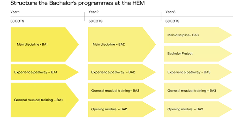 The Haute école de musique de Genève offers a course lasting three years leading to a Bachelor of Arts degree in music and constituting 180 ECTS credits.