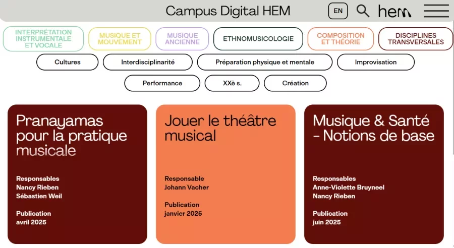 Campus Digital HEM est un espace d'apprentissage numérique, où des ressources pédagogiques sont en accès libre. Régulièrement mis à jour et continuellement enrichi, cet espace est conçu pour nourrir la curiosité, enrichir les connaissances et favoriser la circulation des savoirs dans le domaine des Arts de la scène, et plus particulièrement de la formation supérieure des musiciennes et des musiciens.