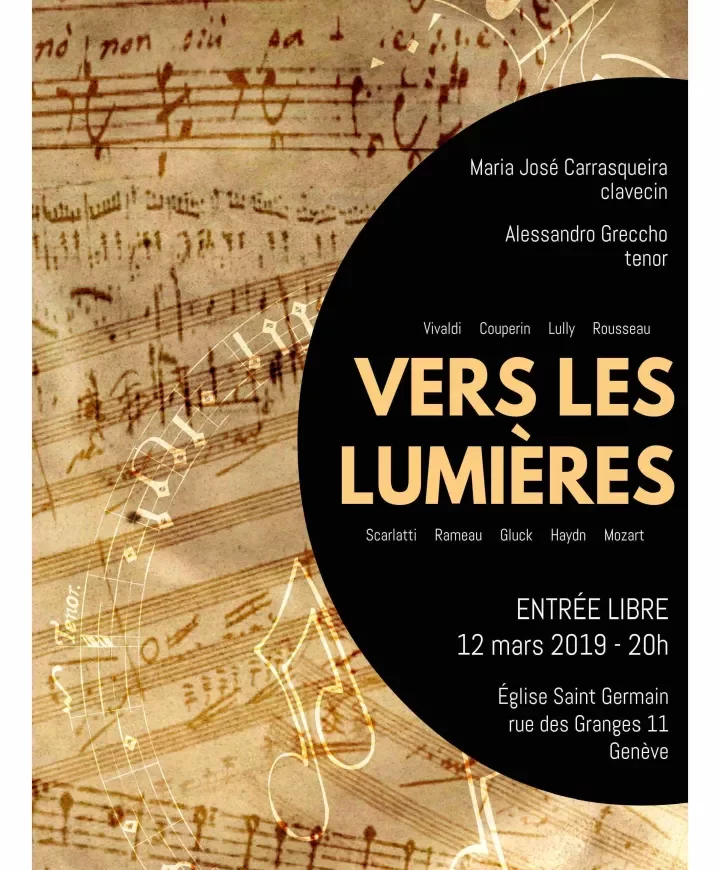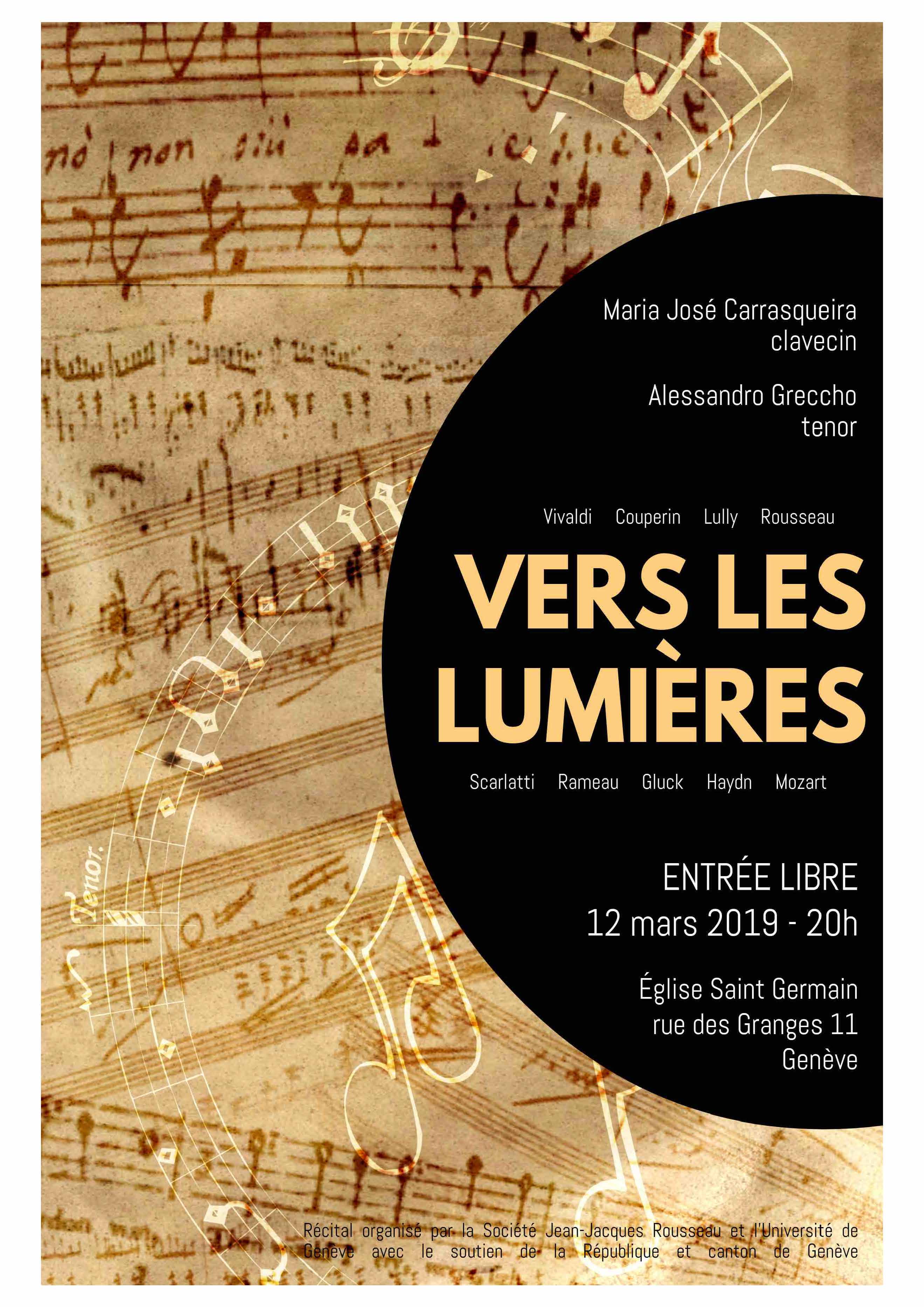 Récital organisé par la Société Jean-Jacques Rousseau et l'Université de Genève. Oeuvres de Vivaldi, Couperin, Lully, Rousseau, Scarlatti, Rameau, Gluck, Haydn et Mozart par Maria José Carrasqueira au clavecin et Alessandro Greccho, ténor.