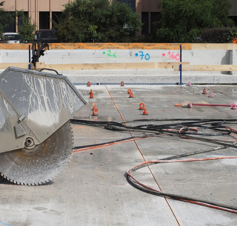 Sciage d’une dalle de béton coulée sur place, EPFL, 2023. © Célia Küpfer