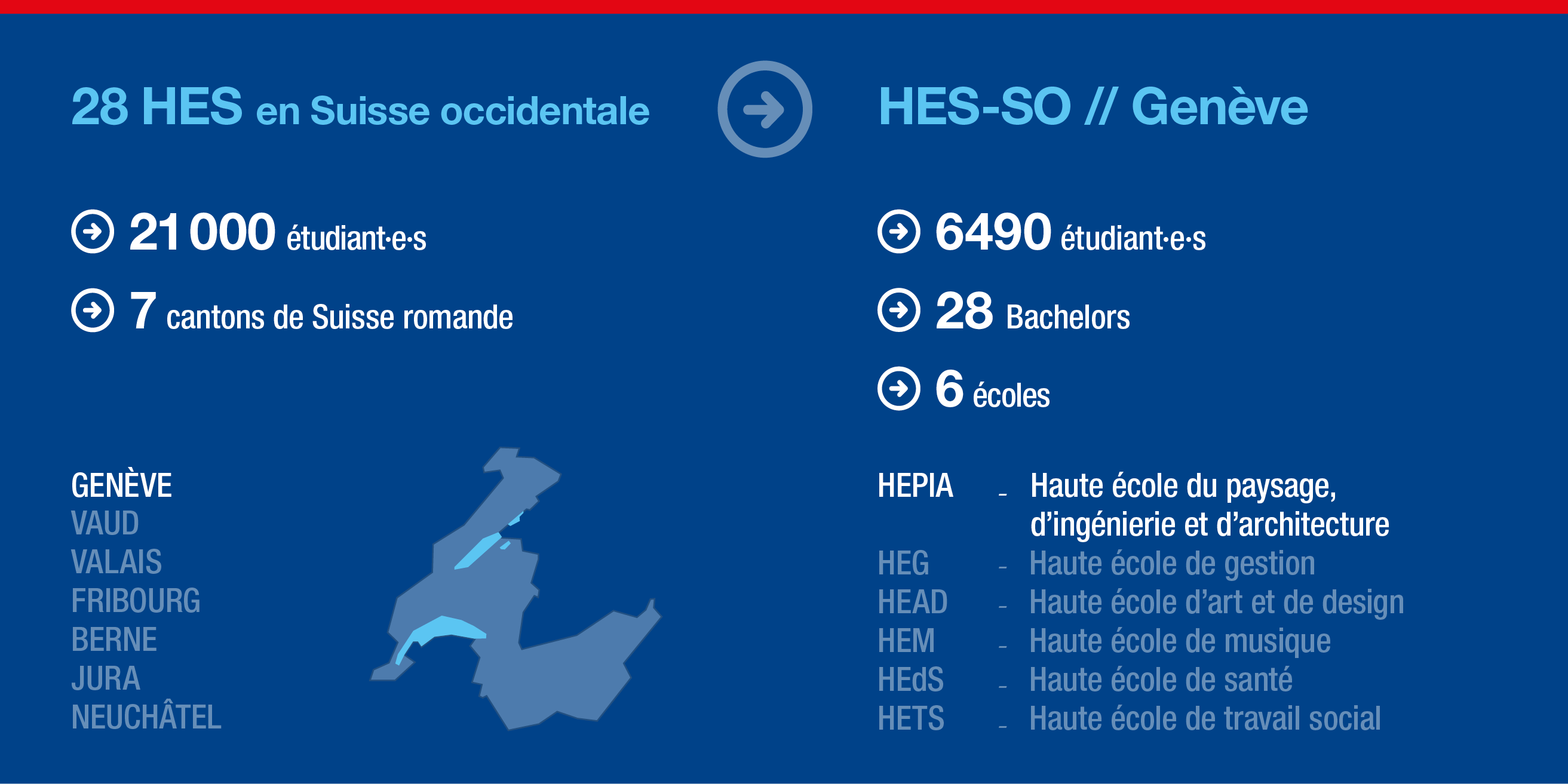 Avec plus de 6'490 étudiantes et étudiants, la HES-SO Genève représente un pôle de compétences riche de 28 Bachelors (y.c. les orientations). La HES-SO Genève renforce le positionnement de Genève dans le réseau de la Haute école spécialisée de Suisse occidentale en mettant en valeur son statut de métropole, sa dimension internationale et transfrontalière et la densité de son tissu économique, social et culturel.