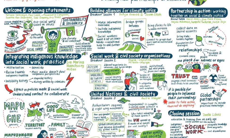 Avec Luz Marina Huenchucoy Millao et l’exemple des Mapuche au Chili, c’est l’importance de l’apport des sociétés autochtones comme source d’inspiration, et la nécessité d’intégrer les connaissances autochtones dans la pratique du travail social qui ont été soulignées. Le travail social a également un rôle à jouer autour de la mise en place de politiques d’adaptation au changement climatique qui tiennent compte des impacts sur la vie et les moyens de subsistance des personnes; ou encore pour soutenir, dans l’accueil des enfants et l’éducation populaire et informelle, les nouveaux modèles éducatifs attentifs à la préservation et l’écologie de notre rapport au monde.