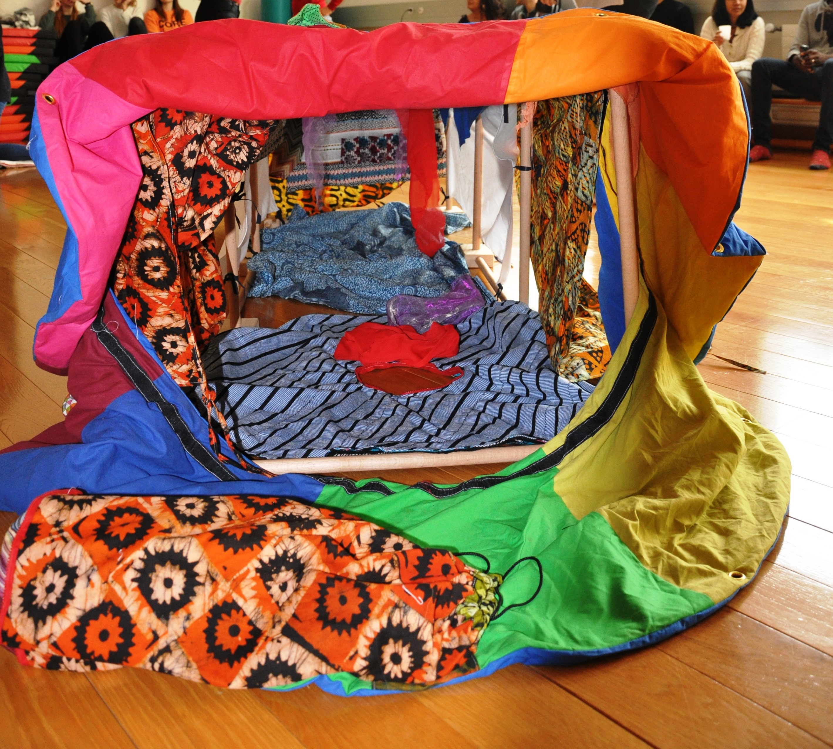 Dans son ventre, la Malle aux trésors recèle d’infinies surprises. Tantôt cabane, tantôt théâtre de marionnettes, tantôt robe virevoltante, … ses composants, objets simples en bois et en textile, se combinent et se complètent de mille et une manières avec pour seule limite l’imagination des participant-e-s, enfants comme adultes.